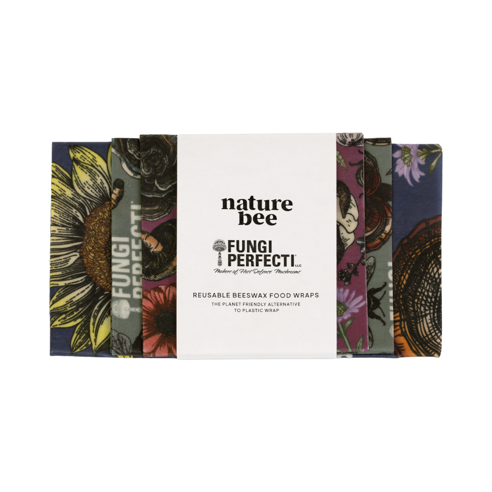 Looking for a sustainable alternative to wrap your packed lunch? Plastic bags are a thing of the past with these beeswax reusable wraps from naturebee. These specially crafted wraps are made with organic cotton, beeswax, organic plant oil, and tree resin, and come in a variety pack of beautiful Fungi Perfecti artwork. They respond to the warmth of your hands to form a seal around your food. Can be hand washed with mild soap and air dried for reuse. For everything from veggies and sandwiches to cookies and cupcakes, all you have to do is wrap, rinse & reuse! Made in the USA.