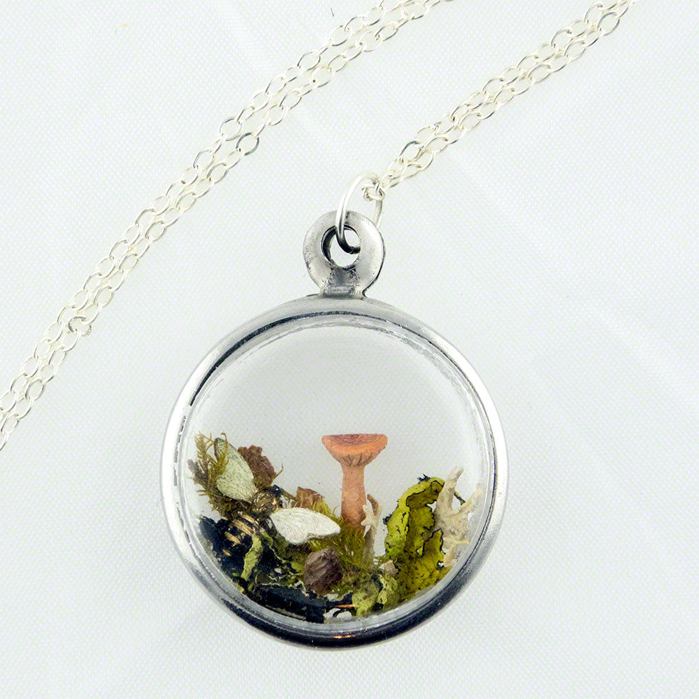 Retail office manager Loni collaborated with a local artist to create these decorative necklaces for our catalog. Each hand-crafted, sealed 24 mm diameter silver pendant contains a beautifully sculpted garden, including a tiny mushroom. A sprinkling of dried Candy Cap mushrooms is added to the pendant prior to sealing, bringing their signature maple-scented sweetness with them. Now you can carry the look and aroma of wild forest mushrooms with you wherever you go! Comes with an 18" silver chain.