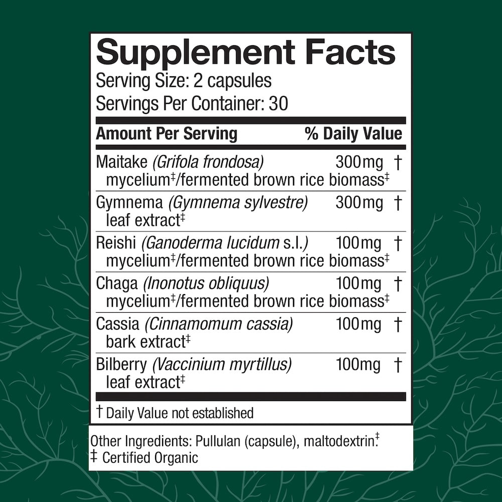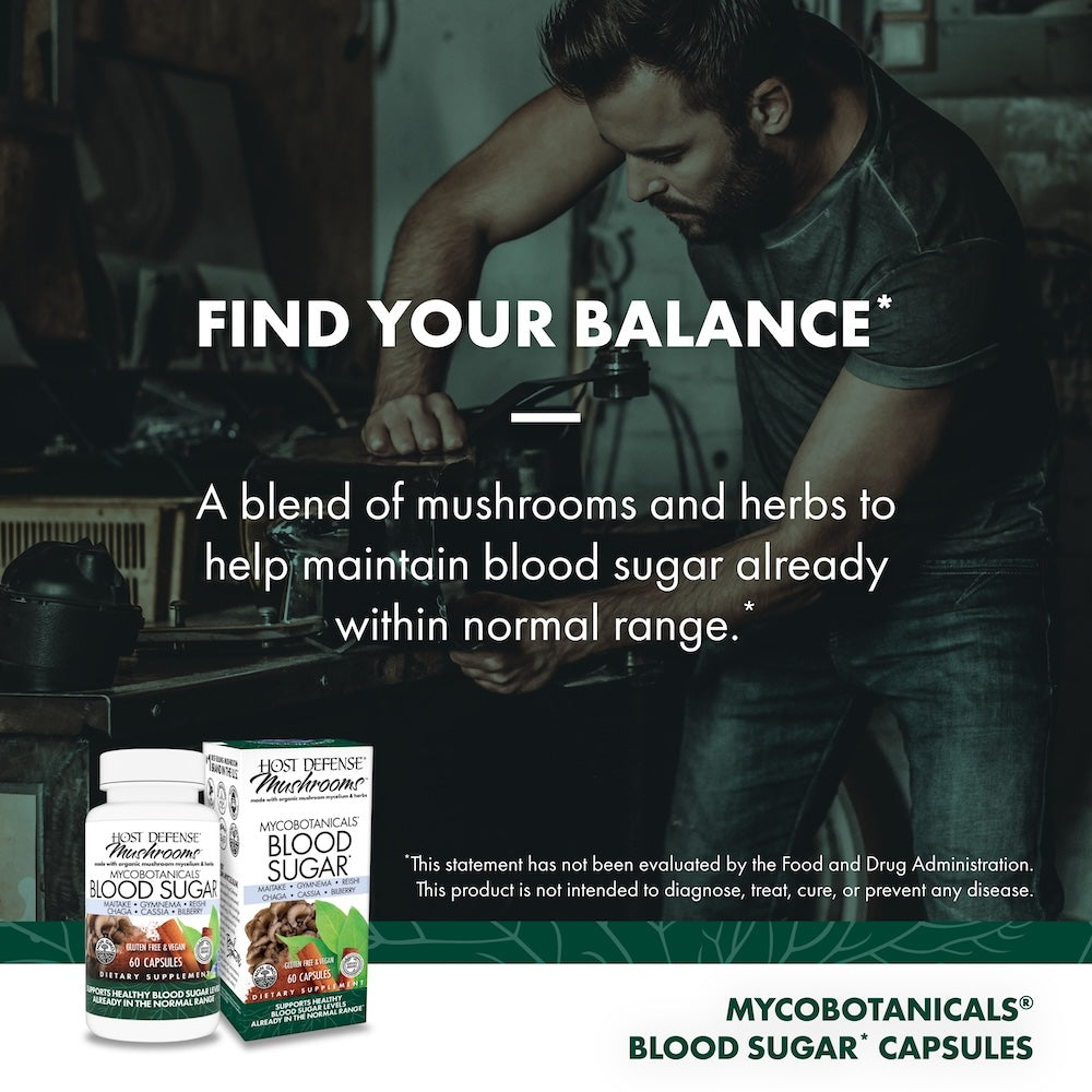 MycoBotanicals® Blood Sugar* is a blend of mushroom mycelium and herbs to help maintain blood sugar already within normal range. Blood sugar, or glucose, is regulated and balanced by our liver and is the fuel that powers our body’s cells. The blood carries glucose to every cell to create the energy that sustains life. Even those with blood sugar within the normal, healthy range may benefit from support.*