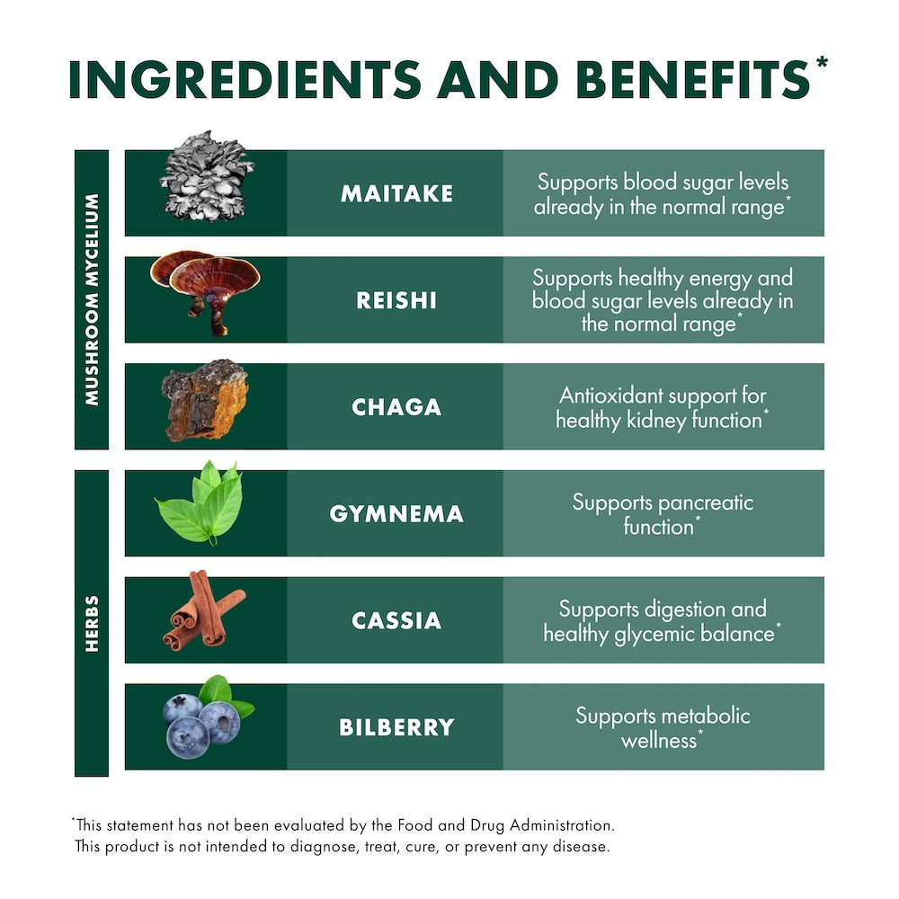 - Maitake - Supports blood sugar levels already in the normal range.*