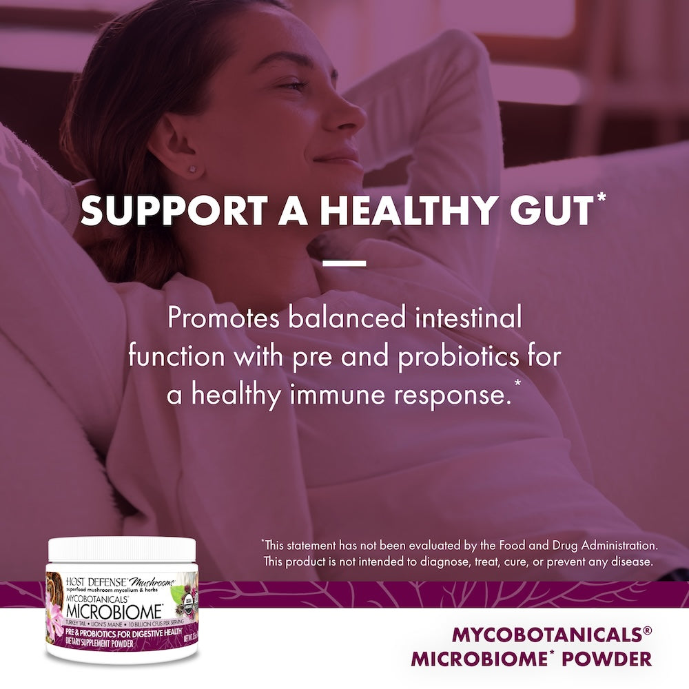 MycoBotanicals® Microbiome* promotes balanced intestinal and immune functioning with probiotics to repopulate the large intestine, prebiotics to feed friendly flora, and compounds that soothe and protect the whole intestinal tract.*