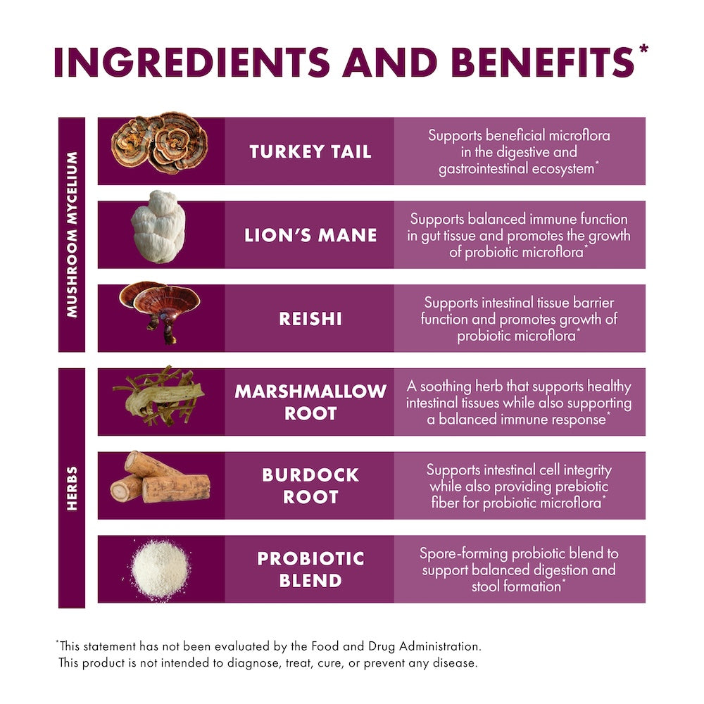 - Lion’s Mane - Supports balanced immune function in gut tissue and promotes the growth of probiotic microflora.*